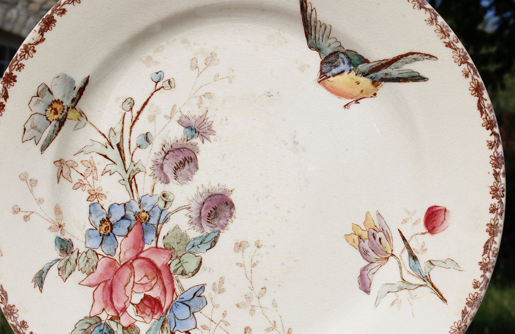 Ancienne assiette à dessert 21.5 cm en faïence polychrome Choisy le Roi E. Bourgeois oiseau