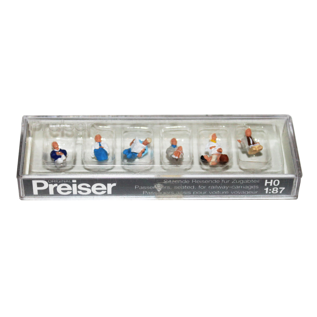 Coffret original Preiser n°10298 comprenant 7 figurines de passagers assis, idéales pour équiper les voitures voyageurs ou scènes d’intérieur à l’échelle HO 1:87.