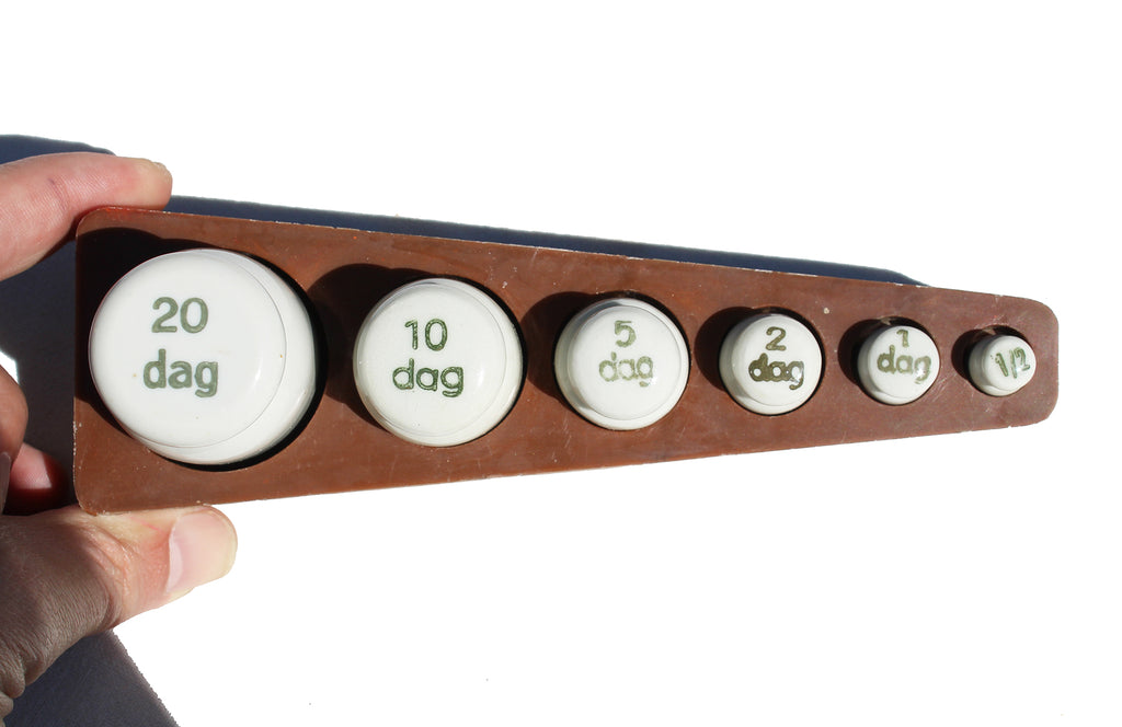 Cette série est composée de poids de 200 gr., 100 gr., 50 gr., 20 gr., 10 gr. et 5 gr. ( unité de mesure dag = décagramme ). Chaque poids est lesté par un poinçon en plomb.