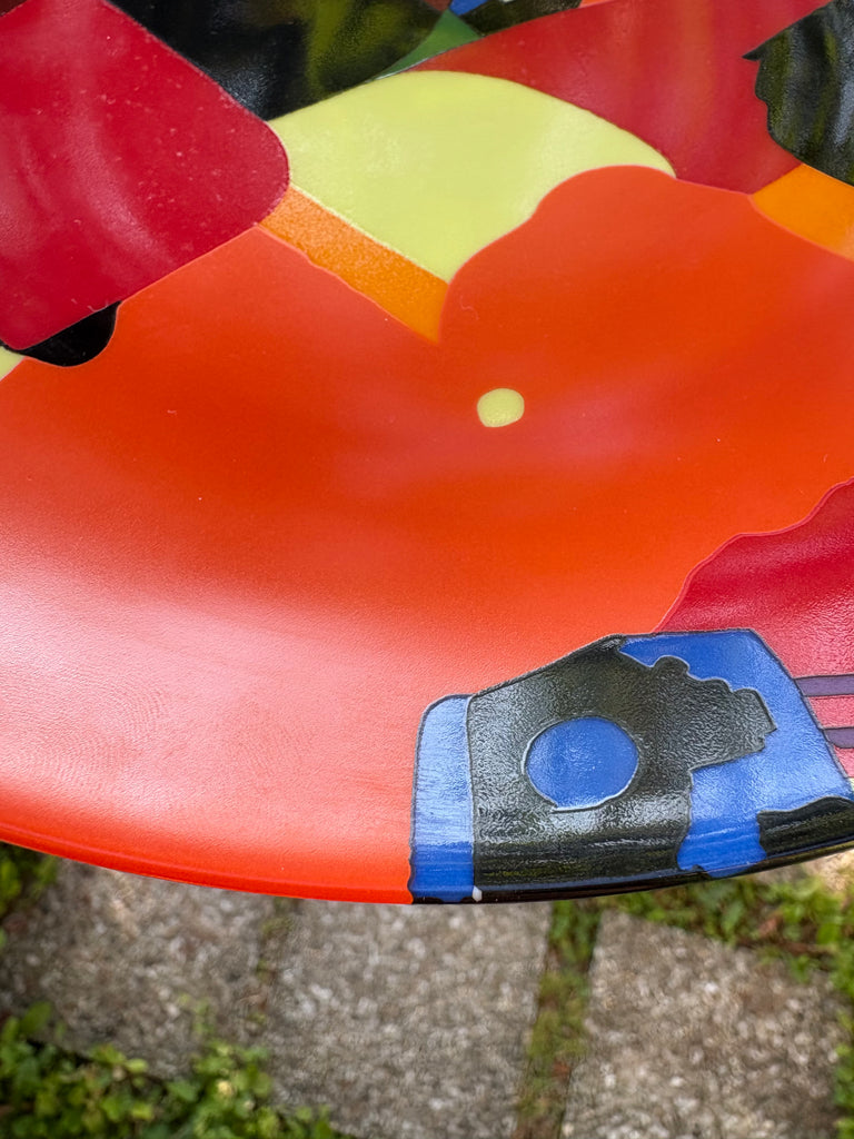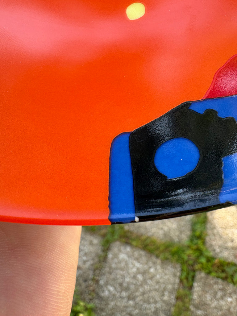 Il y a deux micro égrenures d'à peine 1 mm sur le rebord de l'assiette ainsi qu'un petit saut d'émail sur la sérigraphie. Ces petits défauts restent peu visibles, voir les photos.