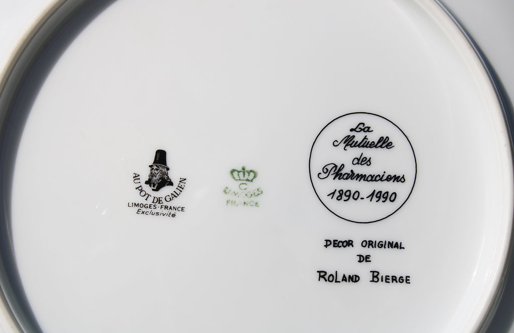 Cette assiette a été éditée en 1990 pour le centenaire de la Mutuelle des Pharmaciens, en porcelaine de Limoges " Au Pot de Galien ".