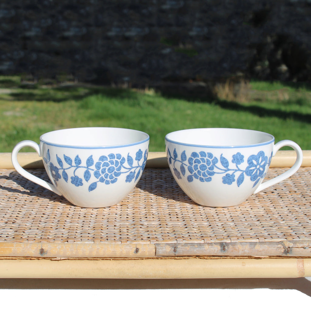 Paire de tasses à déjeuner / thé, modèle Montana, en porcelaine premium blanche, décorées d’un élégant motif floral bleu. Paroi fine, finition soignée, qualité haut de gamme.