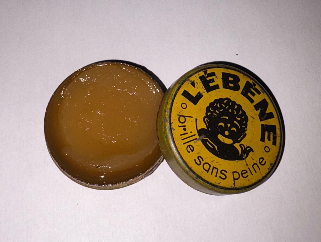 La boîte en tôle lithographiée contient encore de la cire, voir la photo.