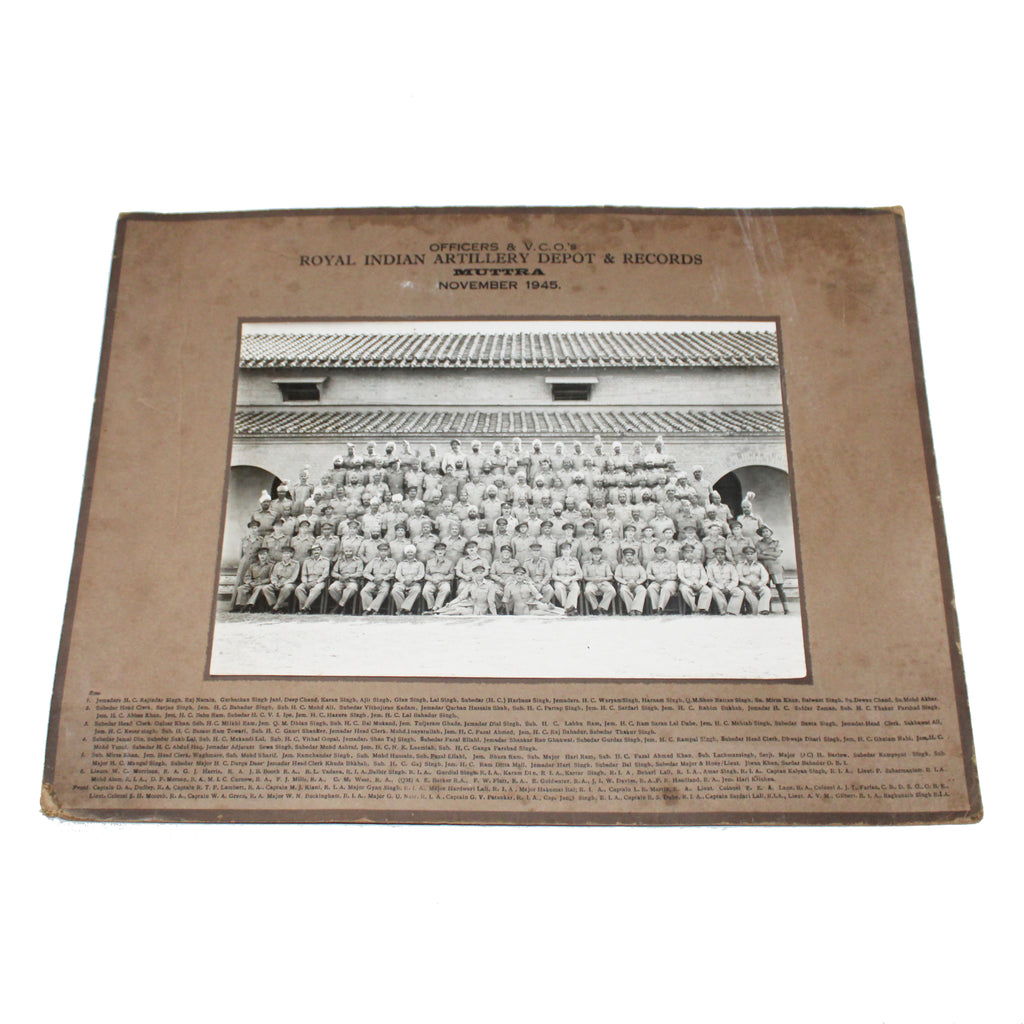 Grande photographie militaire originale représentant les Officers & V.C.O.’s du Royal Indian Artillery Depot & Records, prise à Muttra (Inde) en novembre 1945.