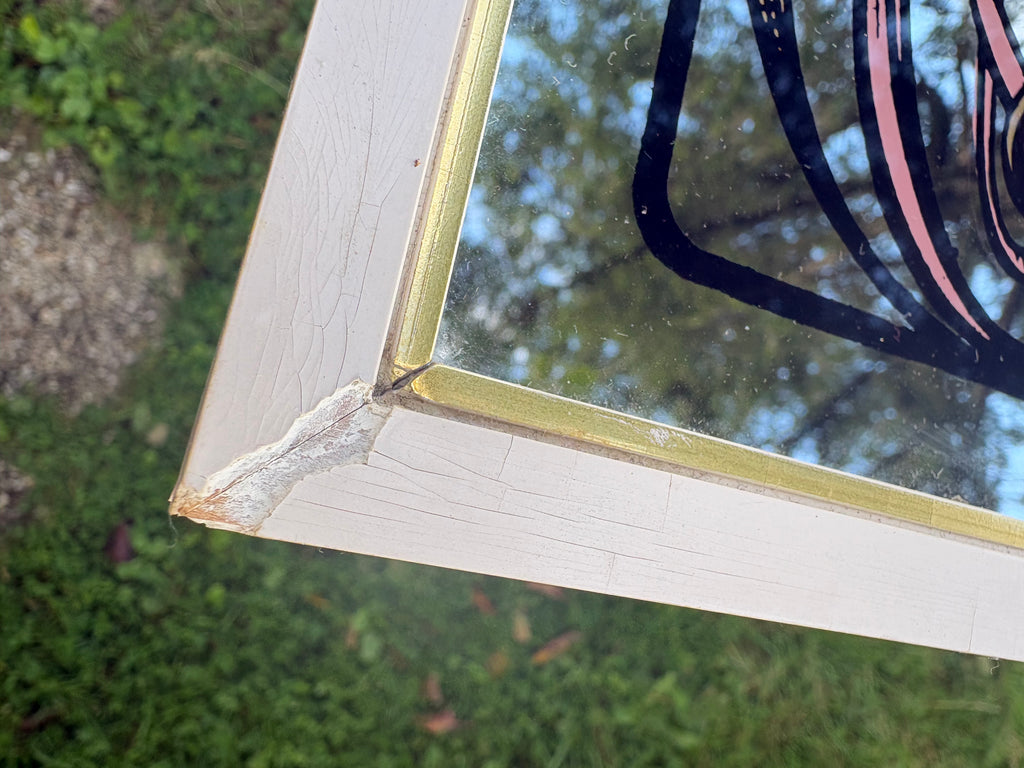 Il y a un accident sur le plâtre au niveau de la partie inférieure du cadre ainsi qu'au niveau du coin inférieur gauche, voir les photos.