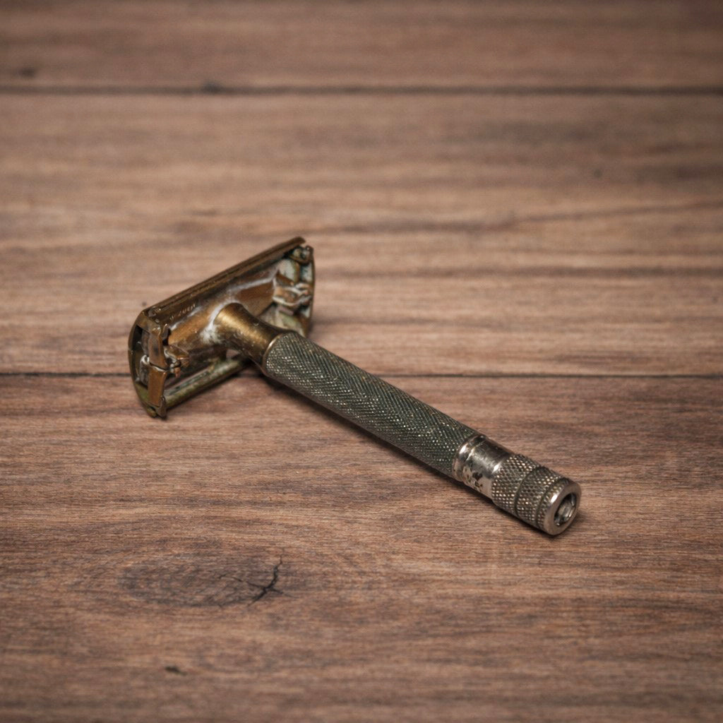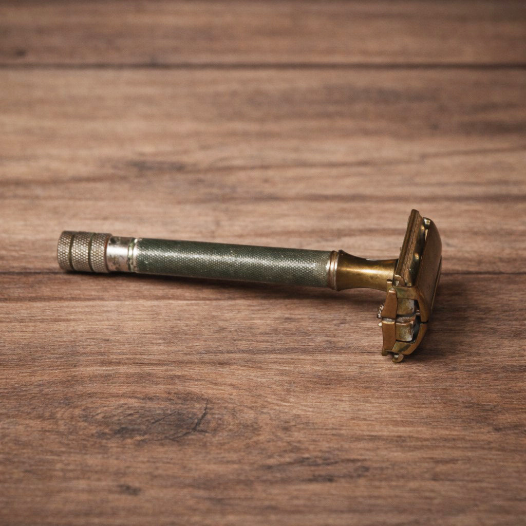Ancien rasoir de sûreté Gillette avec tête en laiton et manche en métal.