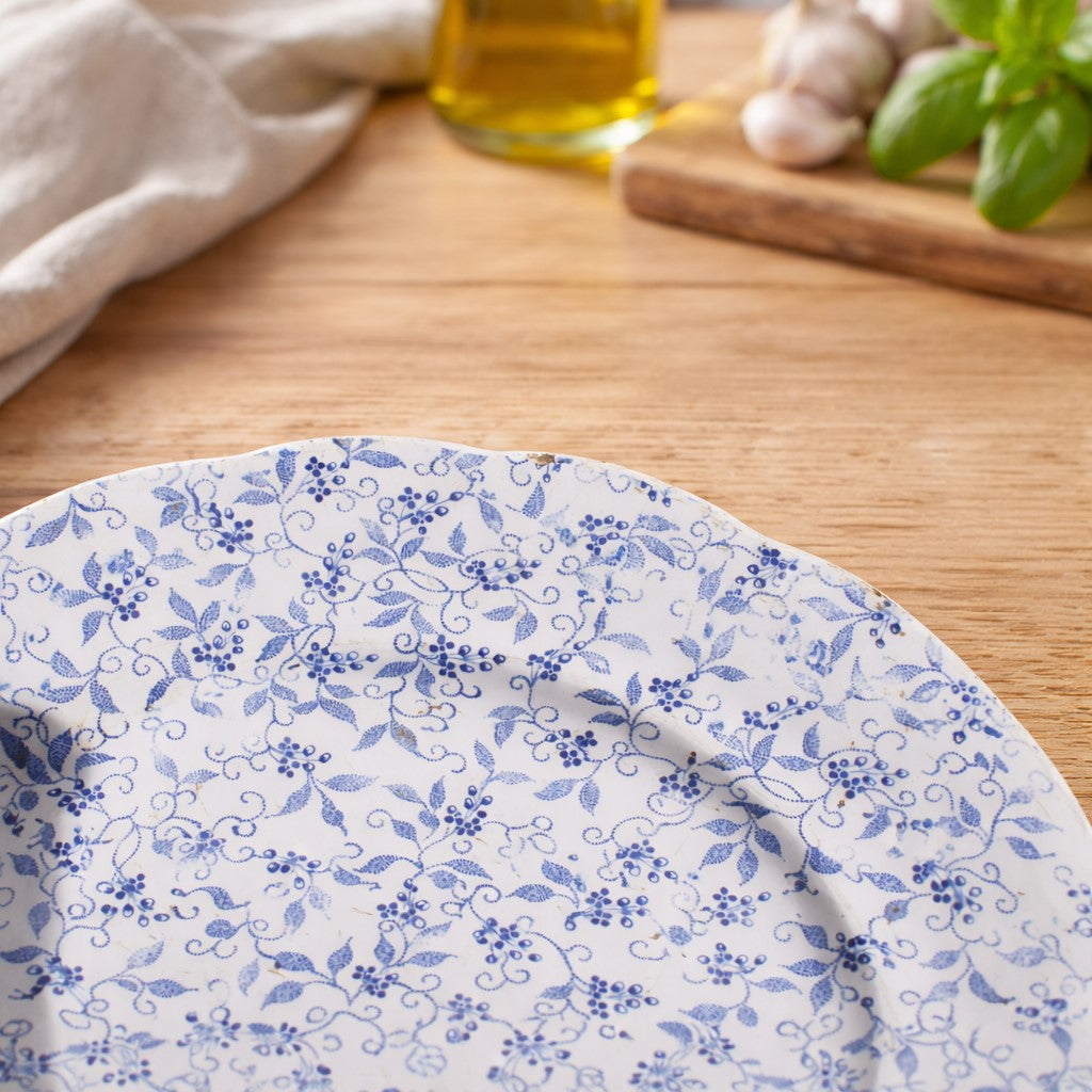 Charmante assiette à dessert ancienne en faïence décorée d’un délicat motif floral bleu sur fond blanc, dans un style romantique typique du dernier quart du XIXᵉ siècle.