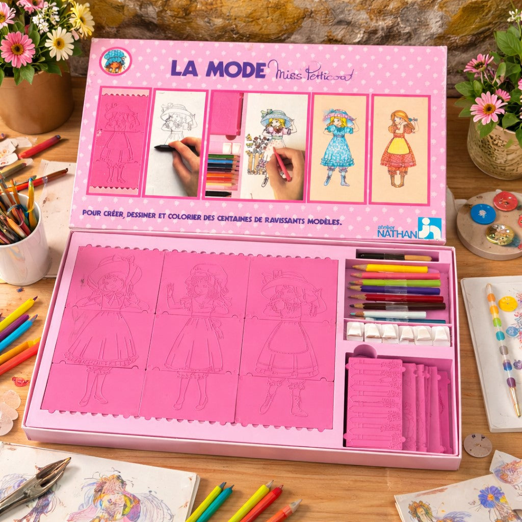 Coffret créatif vintage des années 1980 permettant de créer, dessiner et colorier de ravissants modèles de mode. Un grand classique des ateliers Nathan, apprécié des amateurs de loisirs créatifs et des collectionneurs de jeux éducatifs anciens.