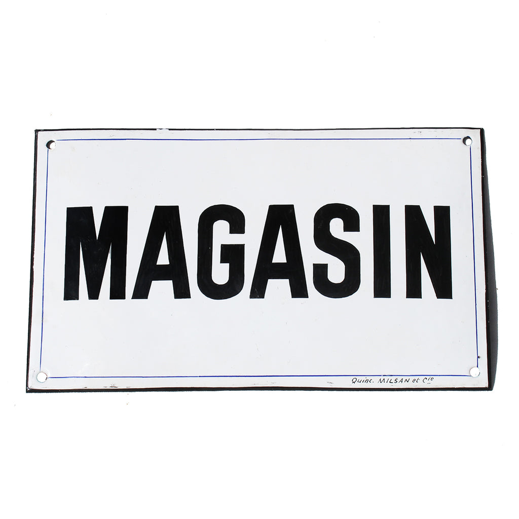 Ancienne plaque émaillée d'utilité bombée / Magasin / 24.8 cm x 14.9 cm.