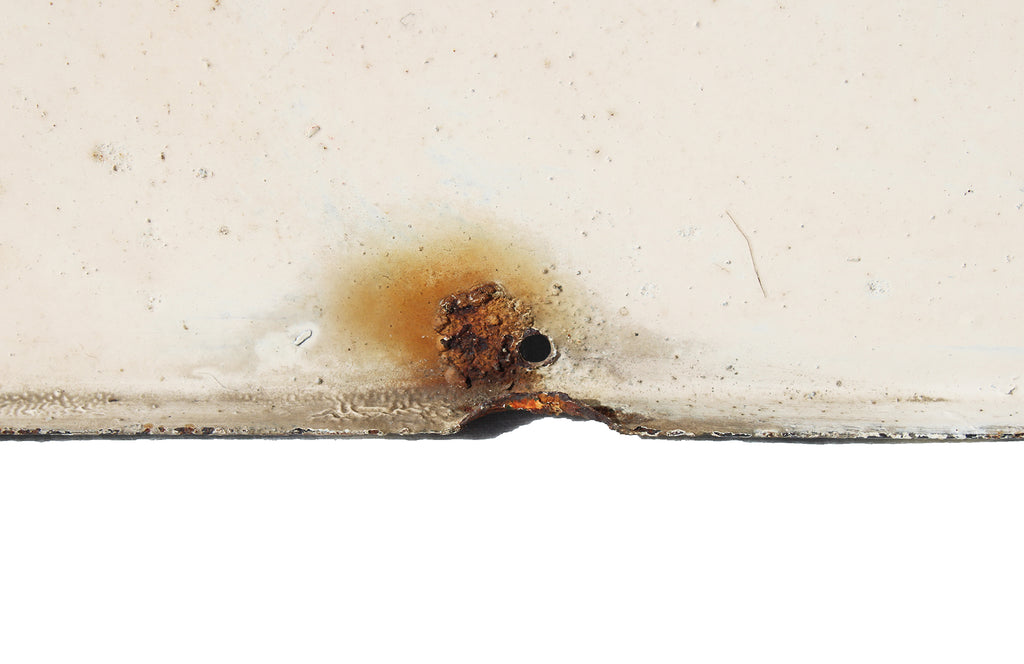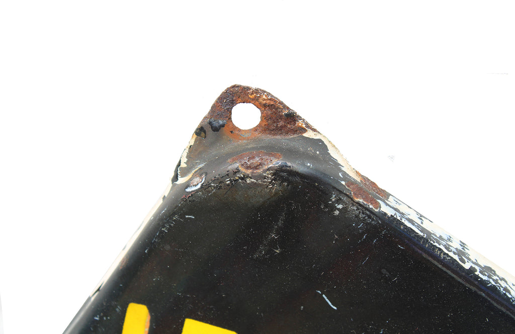 Il y a un éclat d'émail d'environ 4.5 cm en bas de la plaque émaillée, il laisse apparaître de l'oxydation de rouille ainsi qu'un trou rond, voir les photos.