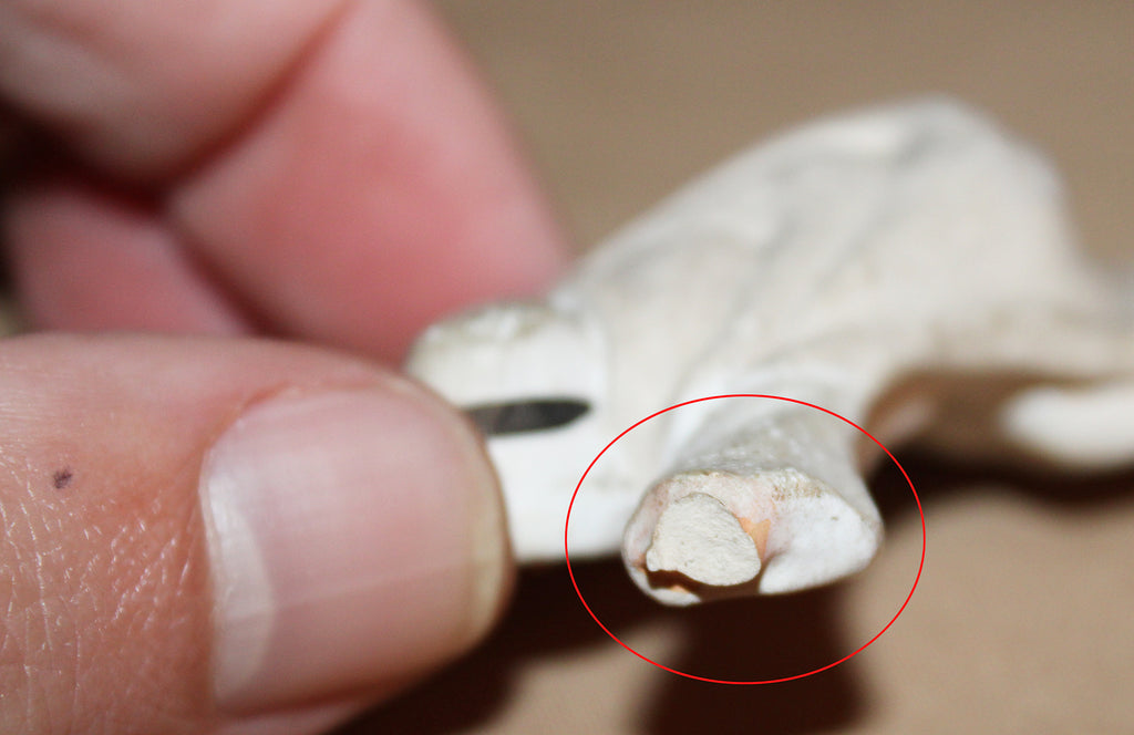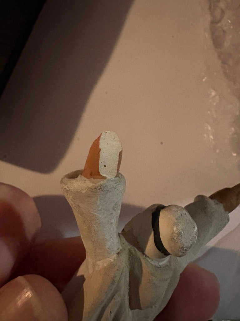 Il y a un manque au dos d'une main de la figurine se tenant debout et levant les bras en l'air, voir la photo.