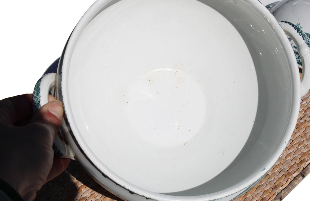 Cette soupière a un vécu de plus de 100 ans et elle n'est en aucun cas dans un état neuf. Il faut donc prendre en compte que malgré une sélection et une description rigoureuses afin de présenter un ensemble de qualité, elle peut comporter de minimes défauts causés par le temps qui passe en plus de ceux indiqués dans la description. Pour avoir un état irréprochable, je vous invite plutôt à vous tourner vers de la vaisselle neuve ou plus moderne.