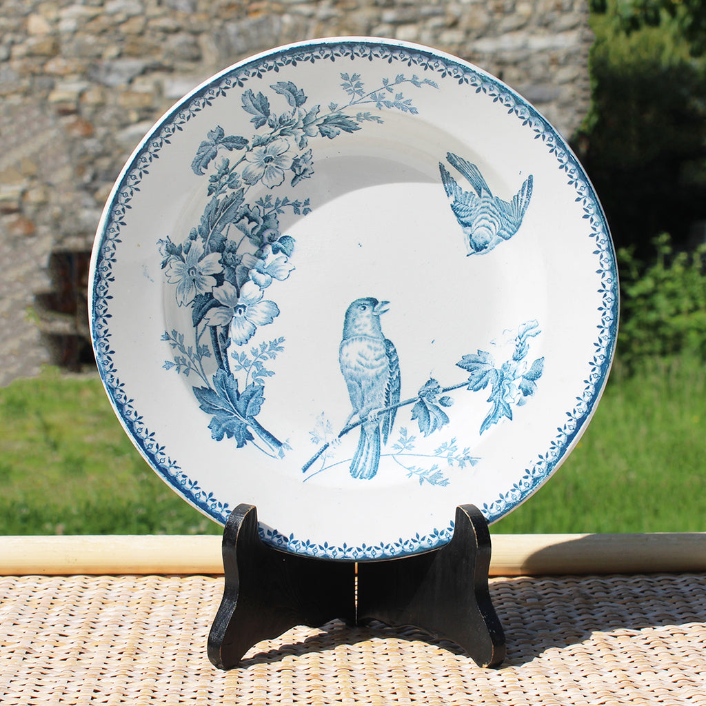 Ancienne assiette creuse 22.7 cm en faïence de Longwy modèle Mésange