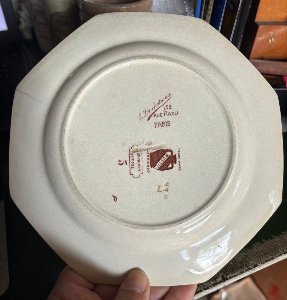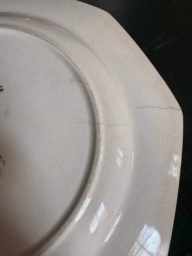 Cette assiette a un vécu de plus de 150 ans et elle n'est en aucun cas dans un état neuf. Il faut donc prendre en compte que malgré une sélection et une description rigoureuses afin de présenter un ensemble de qualité, elle peut comporter de minimes défauts causés par le temps qui passe en plus de ceux indiqués dans la description. Pour avoir un état irréprochable, je vous invite plutôt à vous tourner vers de la vaisselle neuve ou plus moderne.