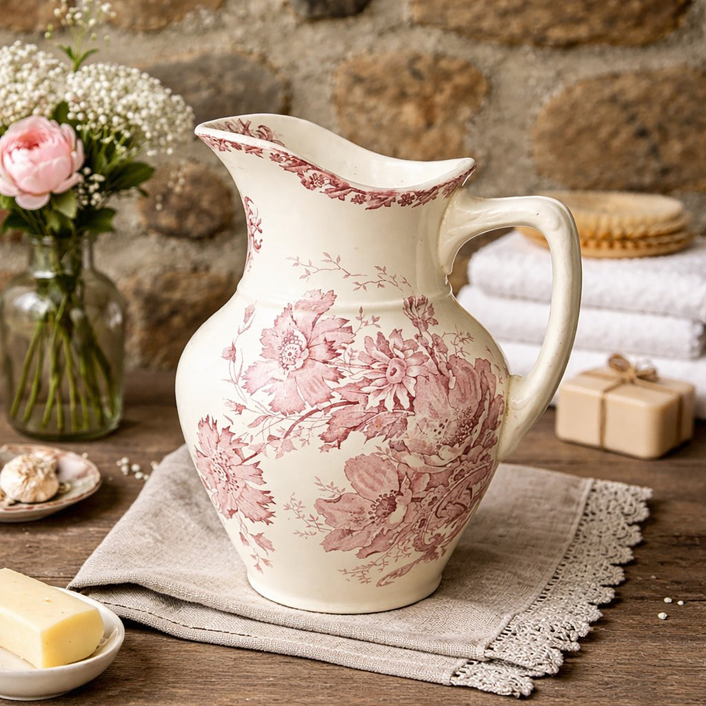 Élégant broc de toilette ancien en faïence fine, réalisé à la fin du XIXᵉ siècle / tout début du XXᵉ siècle, décoré d’un superbe motif floral rose typique de la manufacture Saint-Amand & Hamage (Nord). Modèle Anémone, reconnaissable à son décor raffiné et à son estampille d’époque.