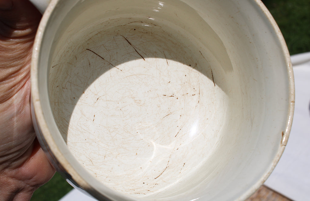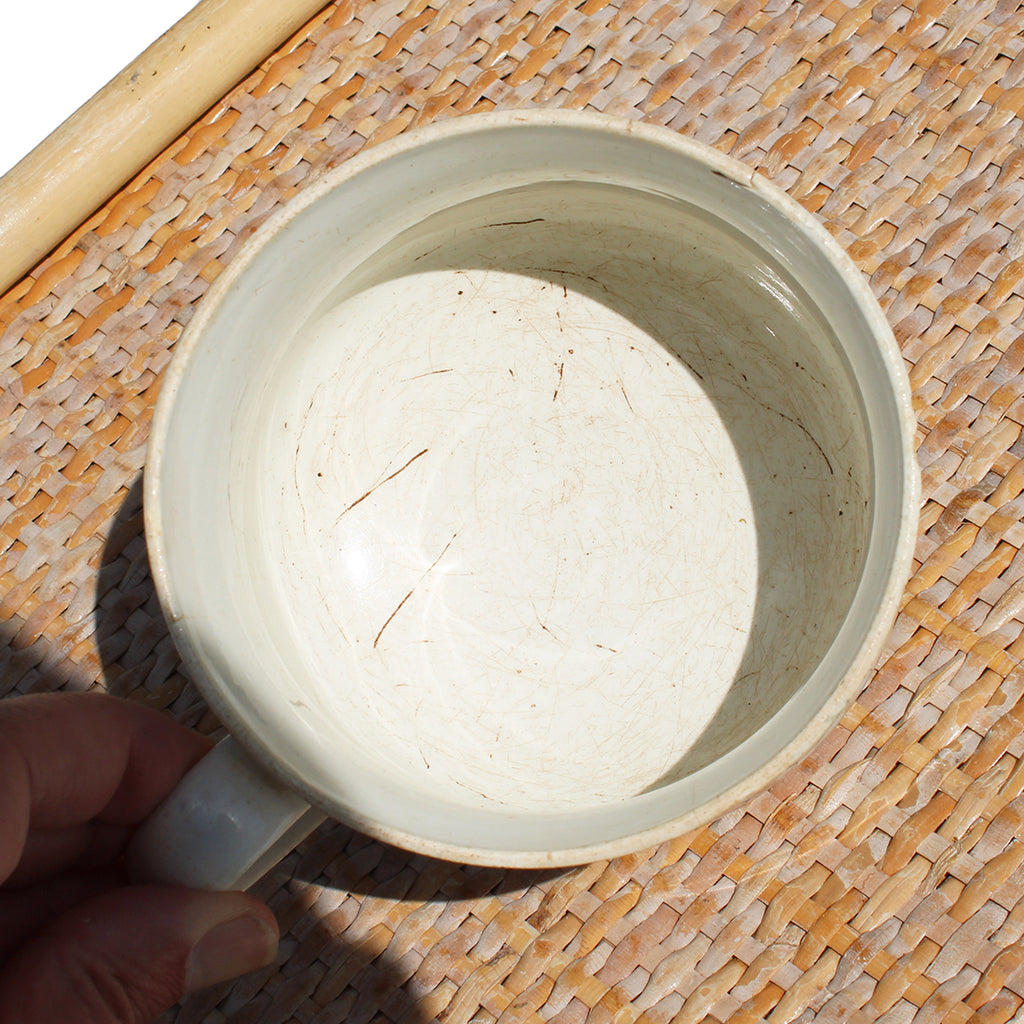 Cette grande tasse à chocolat a un vécu de plus de 150 ans et elle n'est en aucun cas dans un état neuf. Il faut donc prendre en compte que malgré une sélection et une description rigoureuses afin de présenter un ensemble de qualité, elle peut comporter de minimes défauts causés par le temps qui passe en plus de ceux indiqués dans la description. Pour avoir un état irréprochable, je vous invite plutôt à vous tourner vers de la vaisselle neuve ou plus moderne.