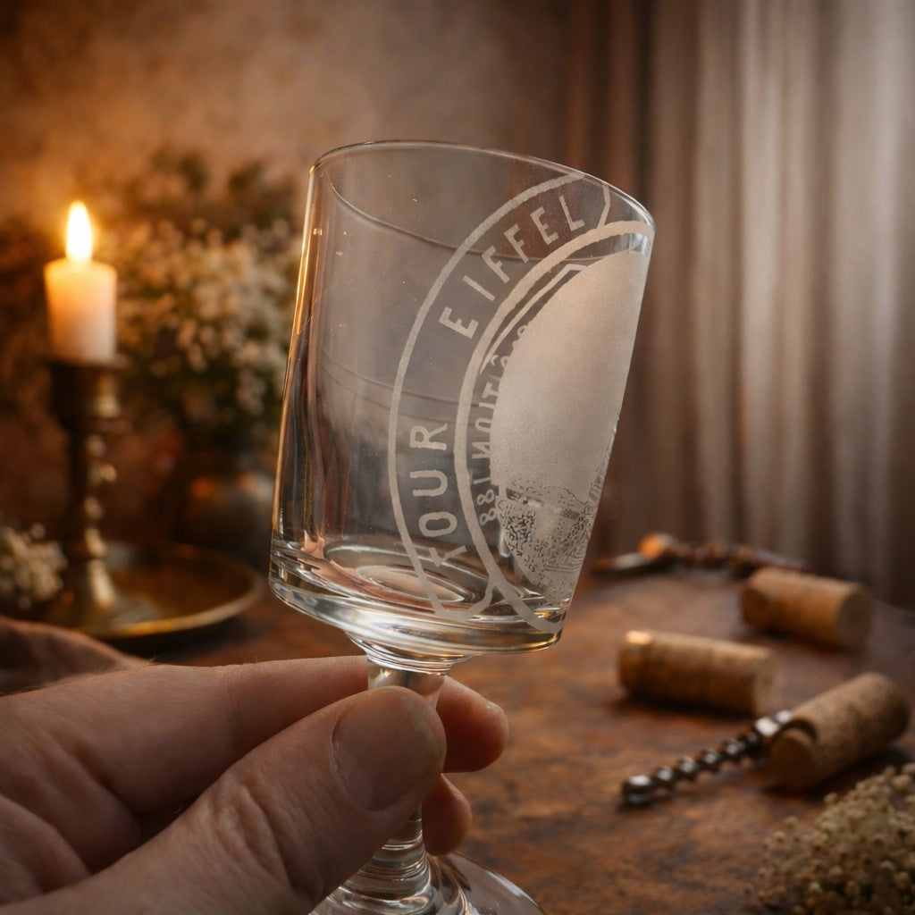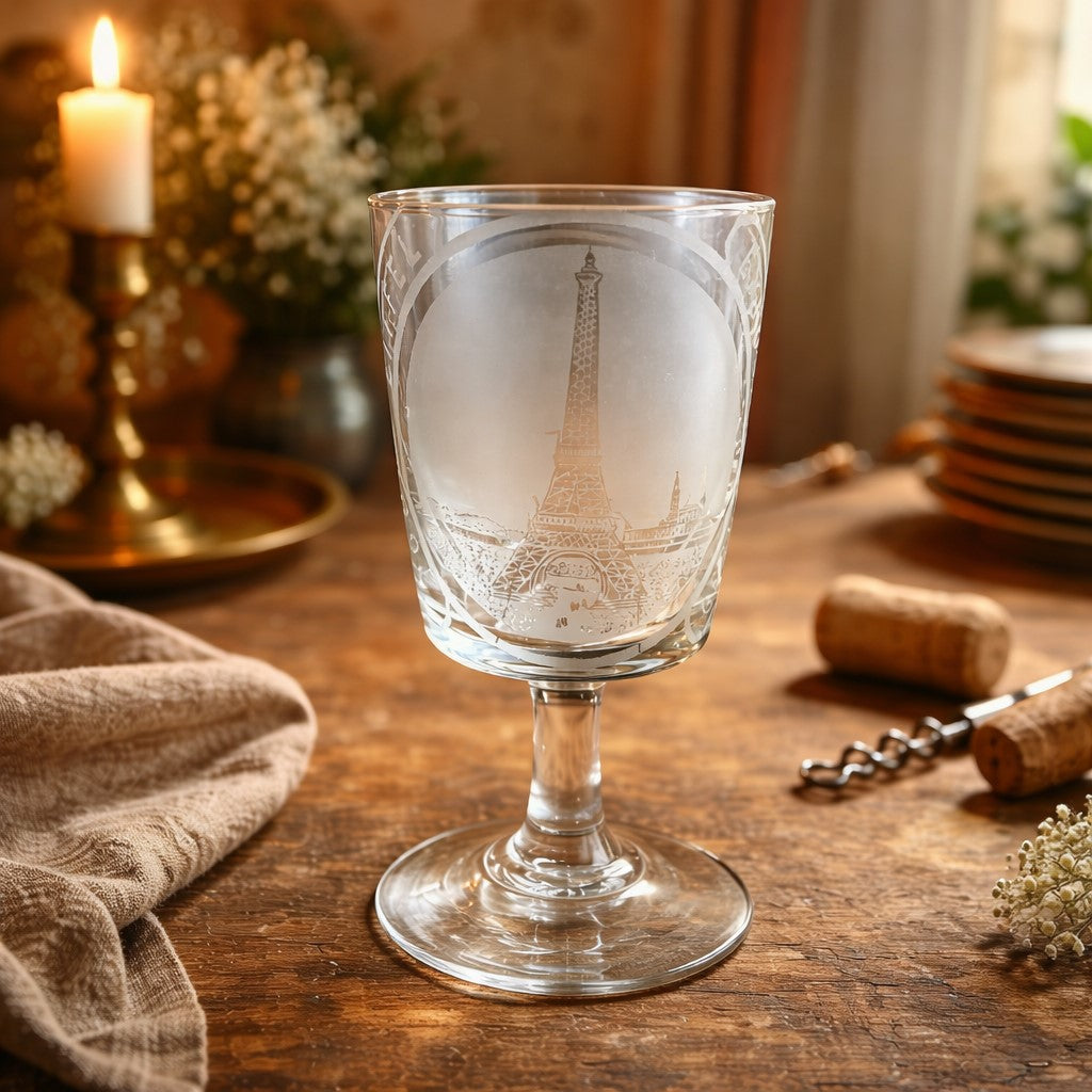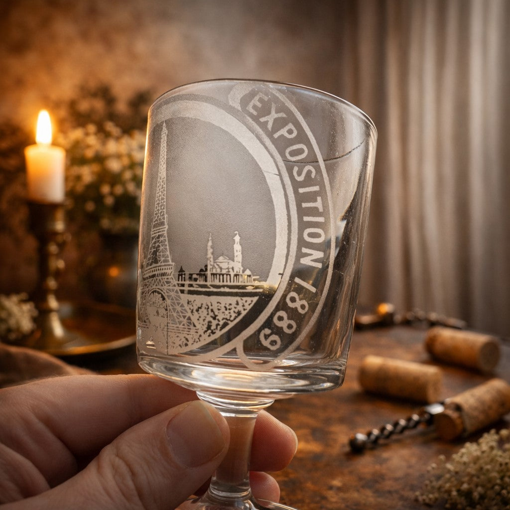 Superbe verre à pied ancien soufflé, décoré d’une gravure à l’acide représentant la Tour Eiffel et les bâtiments de l’Exposition Universelle de Paris 1889.