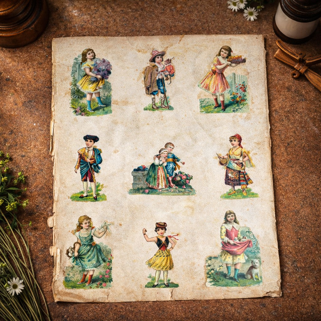 Ancienne planche / feuille d’album garnie de chromos découpis représentant des scènes enfantines, jeunes personnages en costumes variés, ainsi que des compositions florales décoratives.