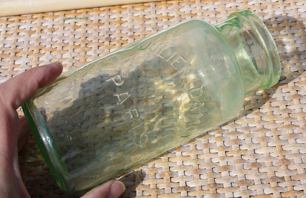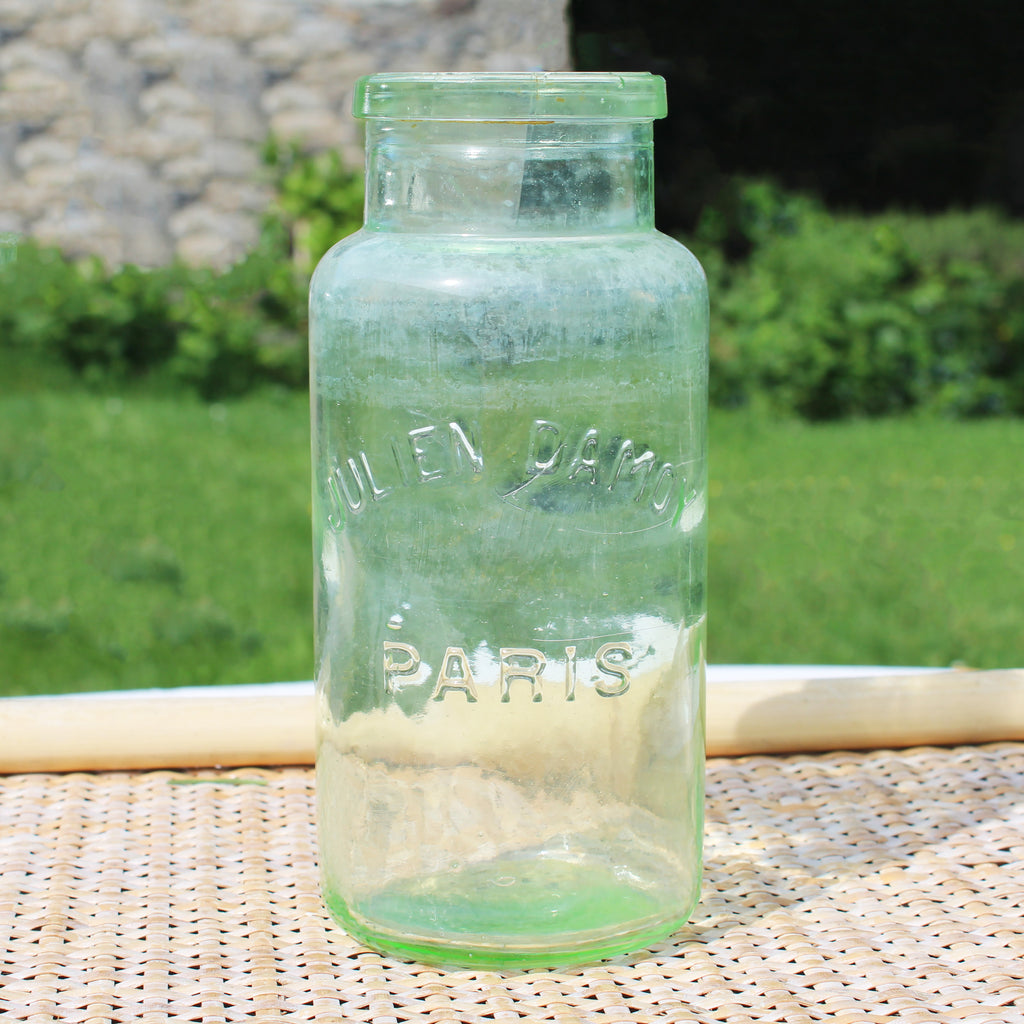 Ancien bocal à cornichons publicitaire Julien Damoy Paris ( verre ouraline ? )