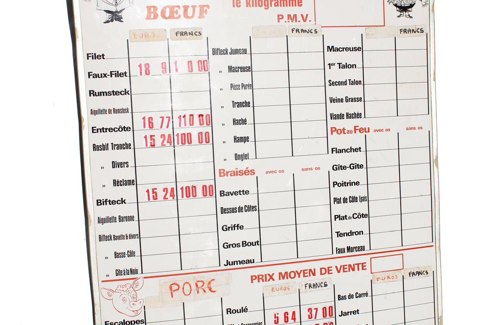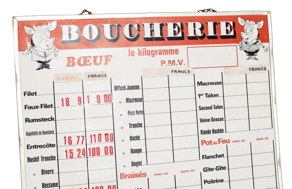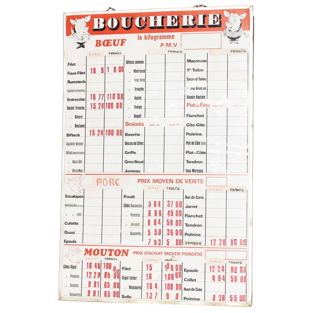 Panneau vintage de boucherie / prix au kilogramme / Boeuf Porc Mouton.