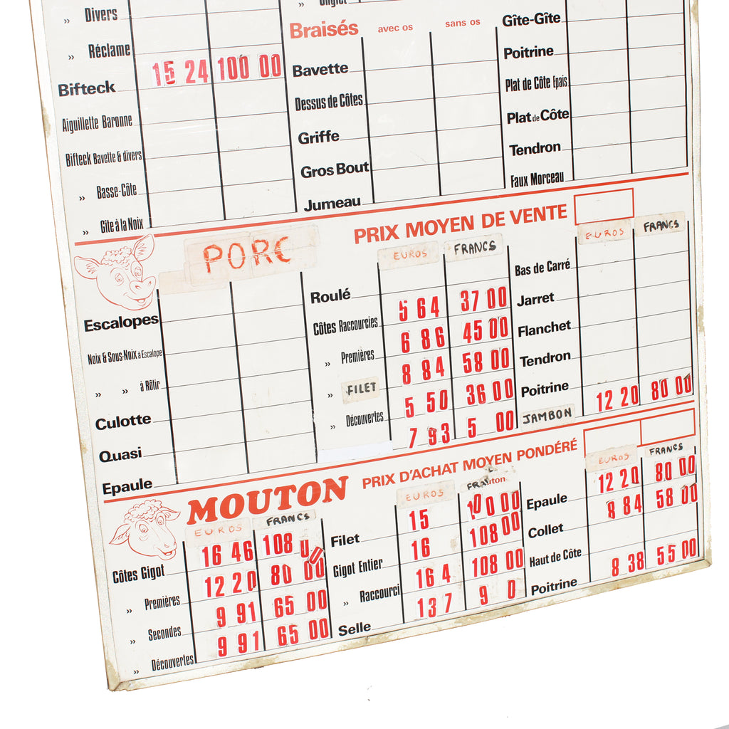 Grand panneau vintage de boucherie / prix au kilogramme / Boeuf Porc Mouton