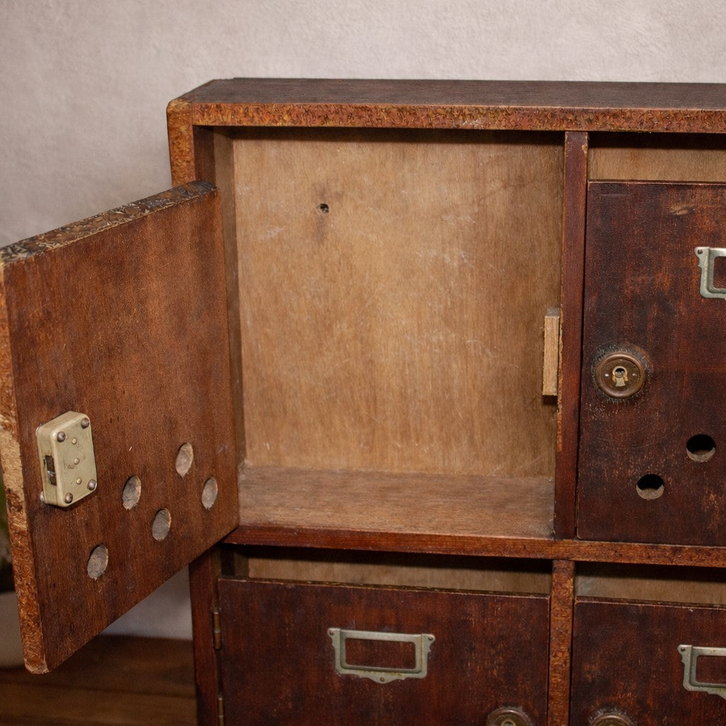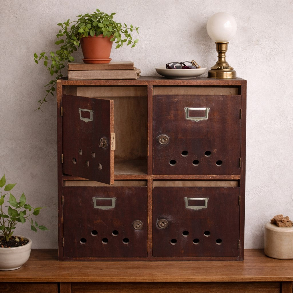 Ce bloc postal ancien est entièrement réalisé en bois contreplaqué. Les quatre portes sont équipées d’aérations rondes et de porte-étiquettes métalliques. L’intérieur des casiers est resté brut, créant un contraste esthétique avec l’extérieur plus sombre et patiné.