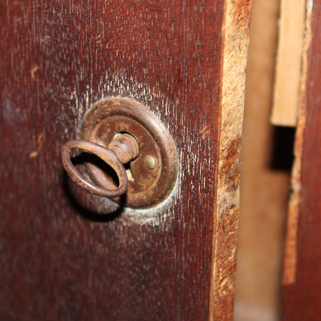 • la serrure du compartiment inférieur droit est en position fermée, mais la porte s’ouvre néanmoins car la butée de fermeture en bois est cassée.