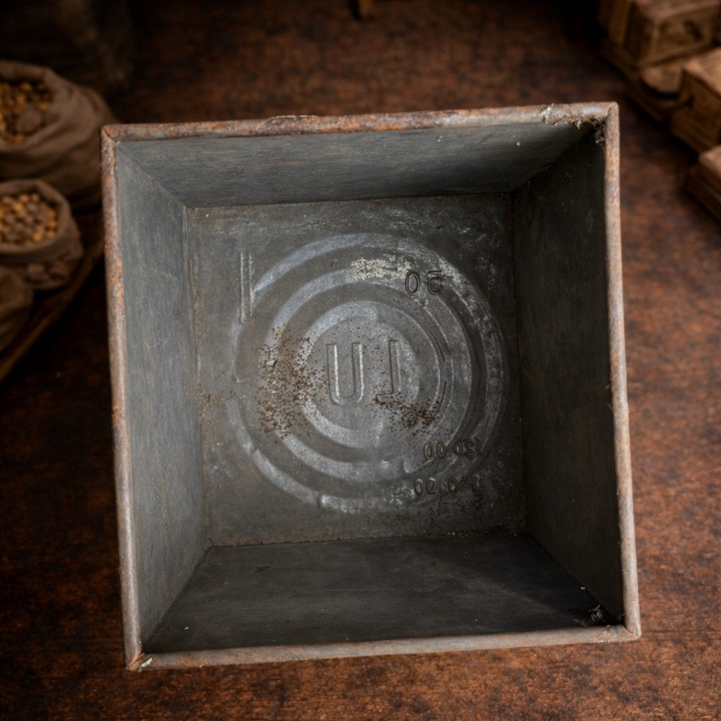 L’intérieur est en fer blanc nu, avec l’estampille circulaire LU en relief, des traces d’oxydation légère et une belle patine métallique d’origine.