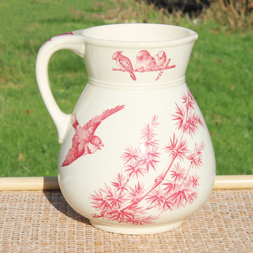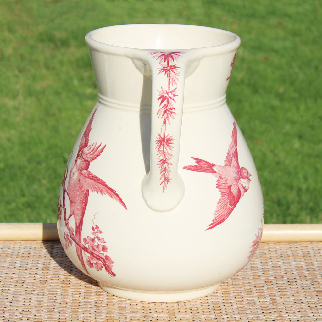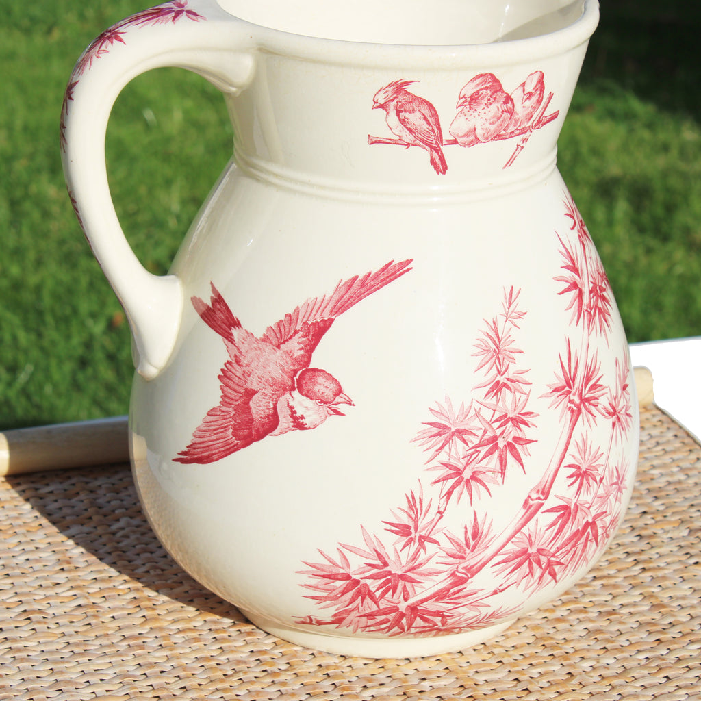 Charmant broc de toilette en faïence émaillée de Longwy, datant de la fin du XIXᵉ siècle, orné du décor « Oiseaux » imprimé en rouge sur fond crème.