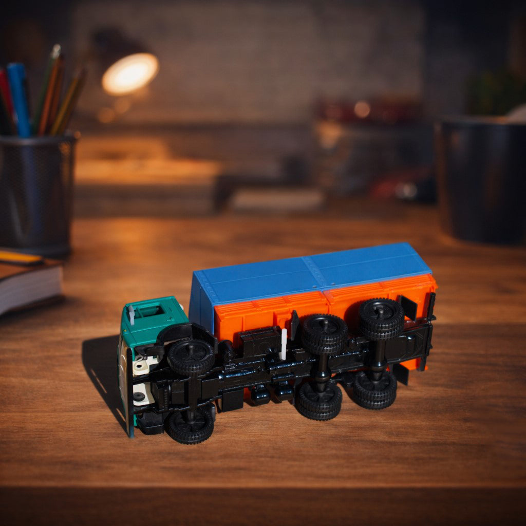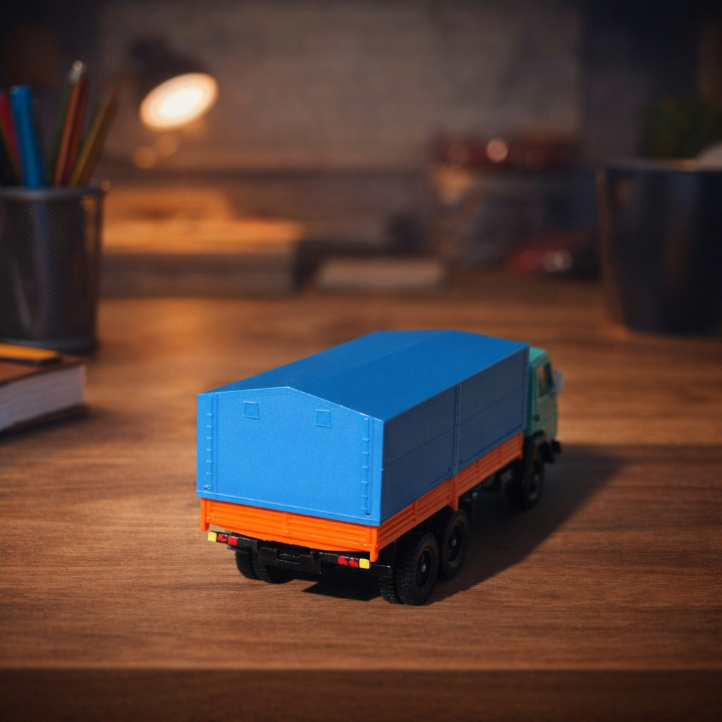 Découvrez ce modèle réduit soviétique KamAZ / KamA3-5320, un classique emblématique des productions miniatures de l’URSS. Cette version présente la configuration typique avec cabine vert turquoise, plateau orange, et bâche bleue, accompagnée de sa boîte d’origine et de son socle noir.