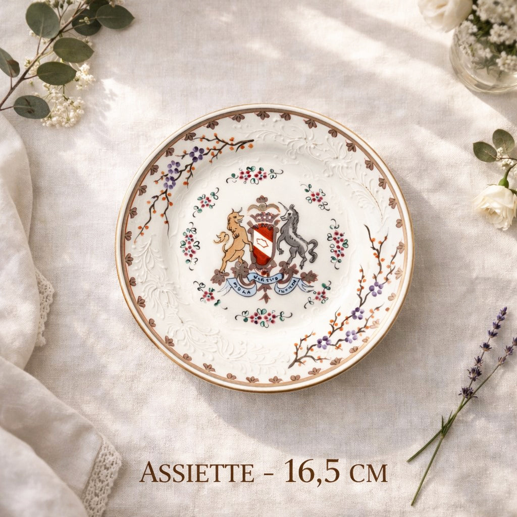 Magnifique service à dessert en porcelaine de la Maison Samson, comprenant un grand plat de 29 cm et cinq assiettes canapé de 16,5 cm. Chaque pièce présente un décor raffiné : blason héraldique polychrome orné de la devise latine Sola Virtus Invicta (« Seule la vertu est invincible »), délicats branchages fleuris, motifs en léger relief et élégante bordure dorée.