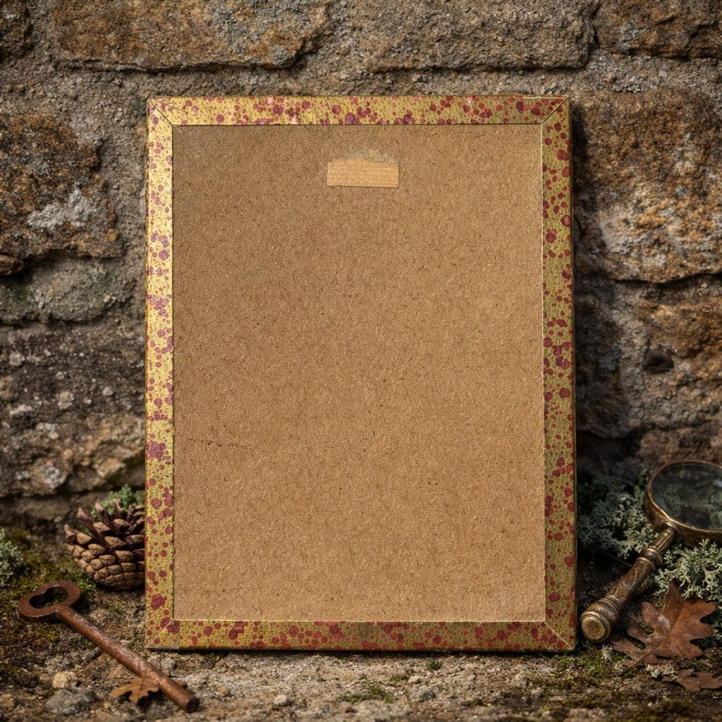 Le cadre ancien à décor moucheté rouge et doré, associé à la protection sous verre, souligne le caractère authentique et décoratif de l’ensemble.