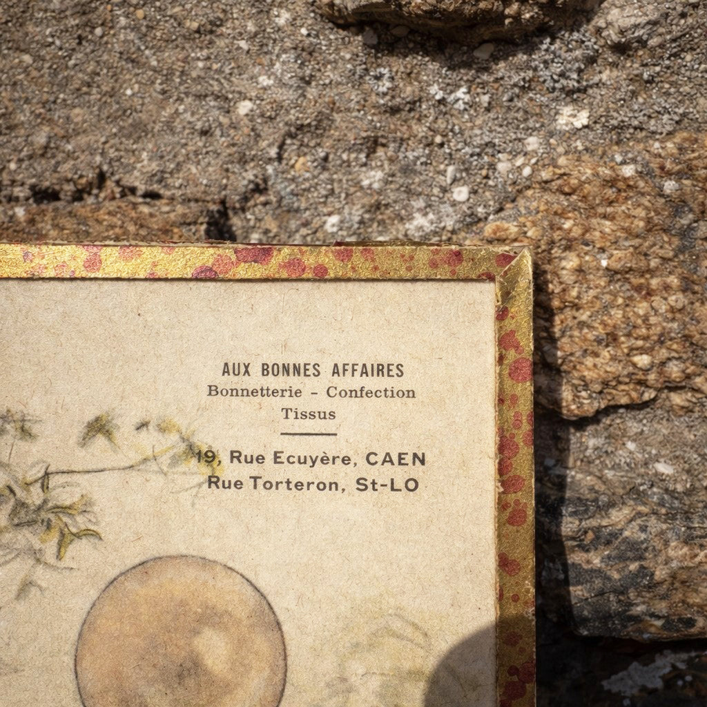 Cette œuvre fait également office de publicité ancienne pour l’enseigne “Aux Bonnes Affaires” (bonneterie, confection, tissus), avec adresses à Caen et Saint-Lô, apportant un intérêt historique supplémentaire.