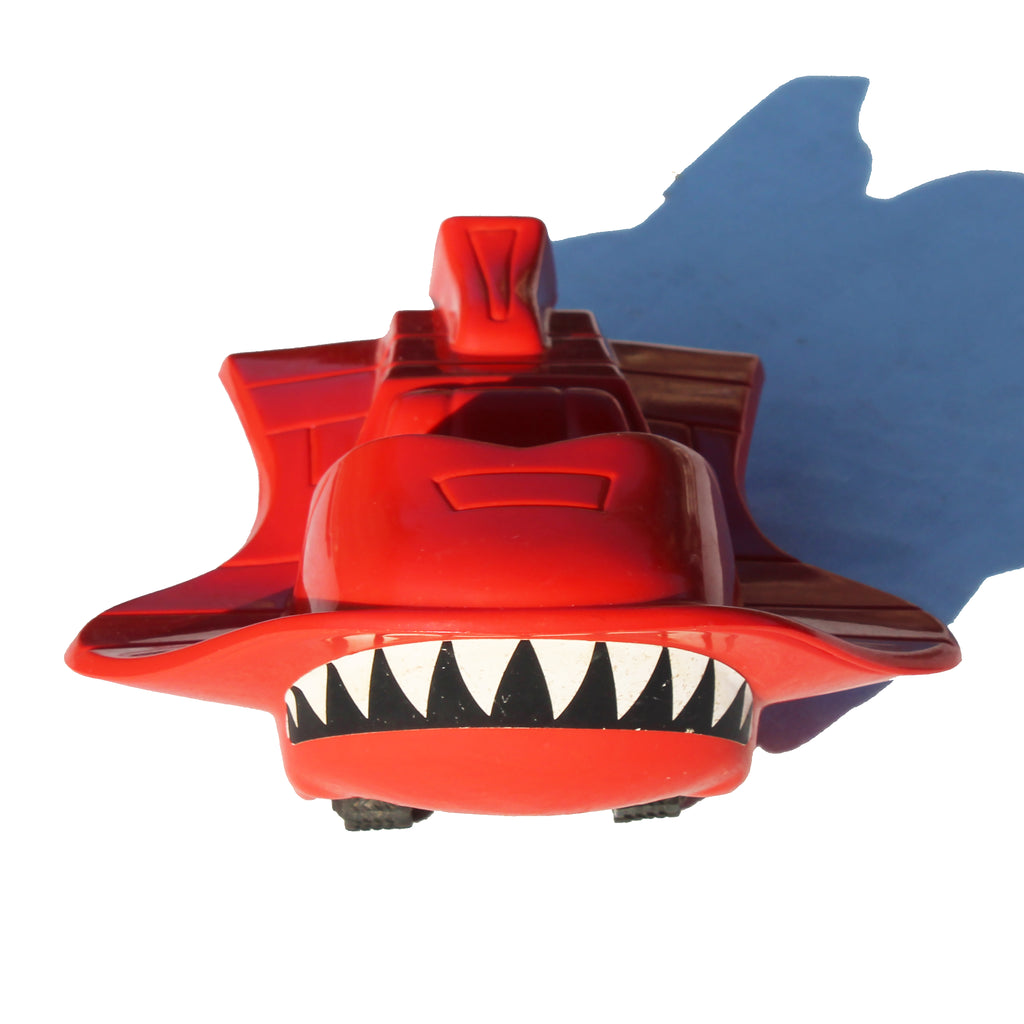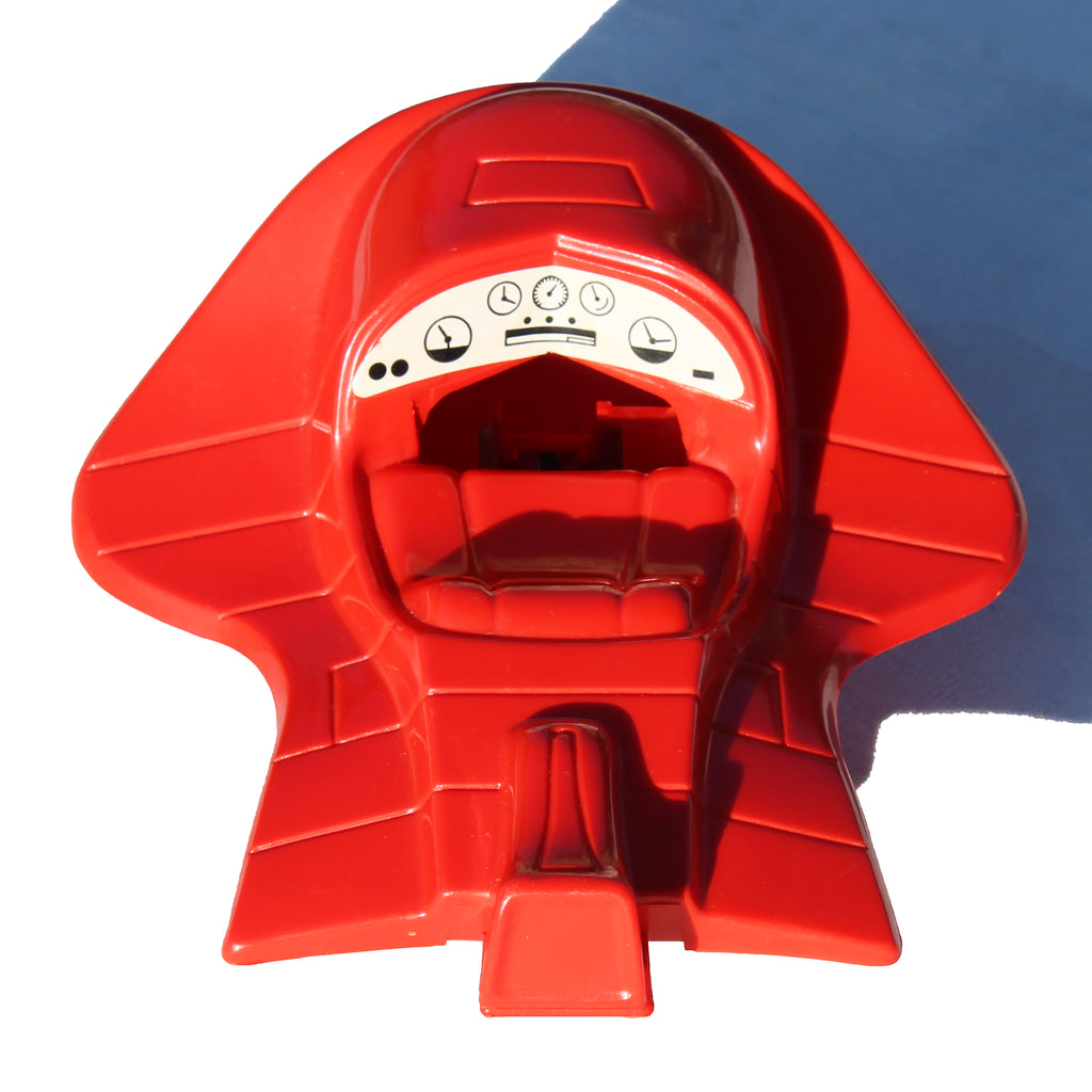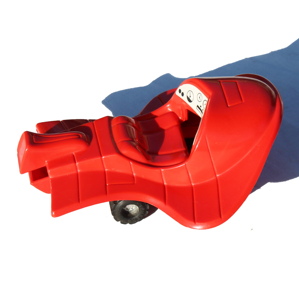 Ce scooter pirate en plastique moulé rouge adopte un design futuriste et agressif, avec proue dentée et ailes latérales caractéristiques de la série.