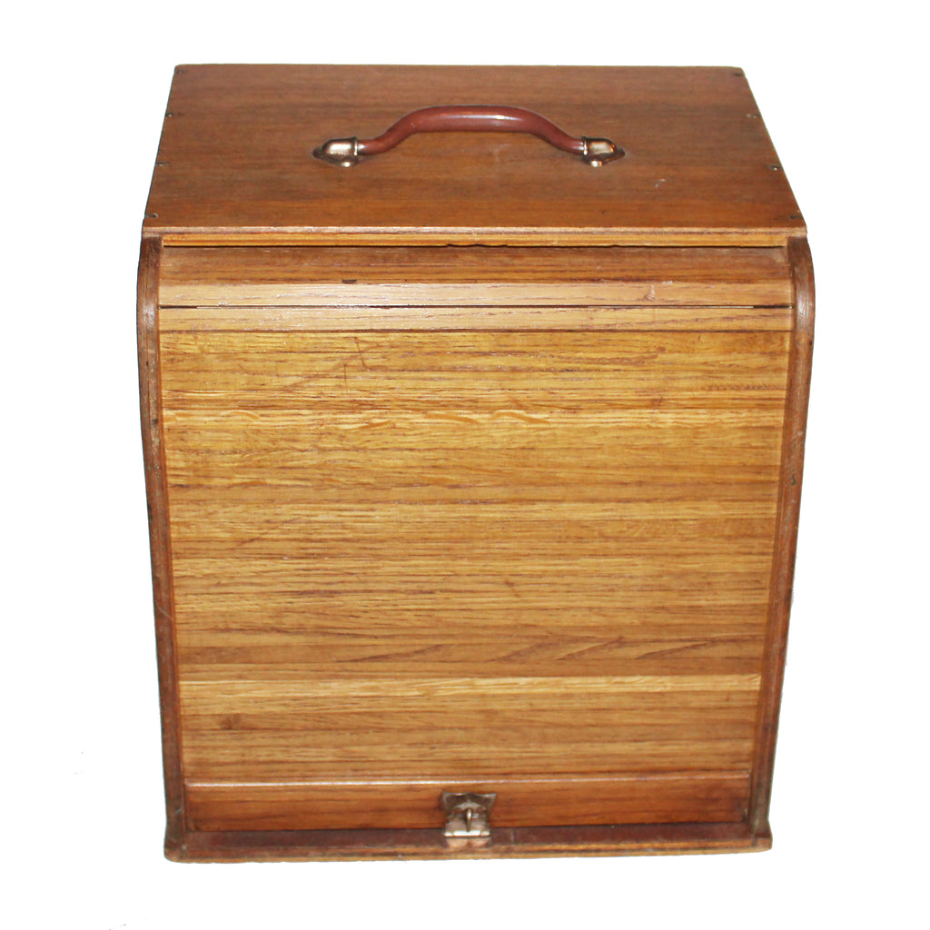 Ancienne layette de dentiste transportable en bois, véritable meuble de métier utilisé dans un cadre professionnel pour le rangement et le transport d’instruments médicaux ou dentaires. Ce meuble est équipé d’un rideau coulissant frontal protégeant les tiroirs. Sa fabrication robuste et son design fonctionnel sont caractéristiques du mobilier médical ancien du XXe siècle.