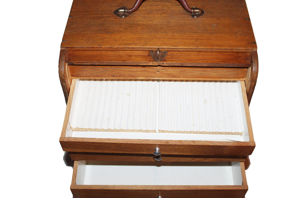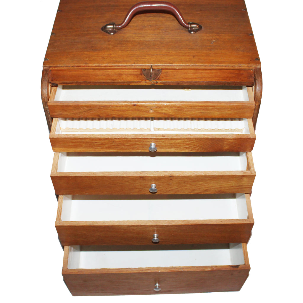 Layette de dentiste transportable ancienne en bois – Meuble de métier – Rideau coulissant