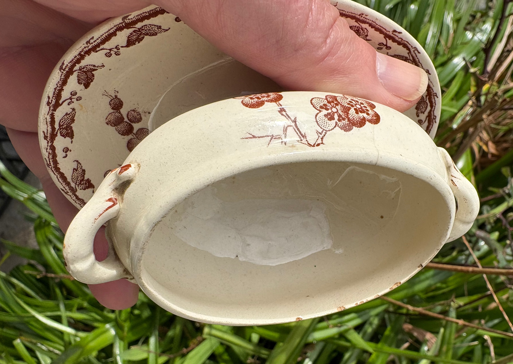 Ce ravissant ensemble se compose d’un moutardier à deux anses latérales et de son présentoir ovale. Le décor floral brun sur fond crème, finement dessiné, est emblématique des productions anciennes de Sarreguemines et apporte une touche élégante et authentique à votre table.