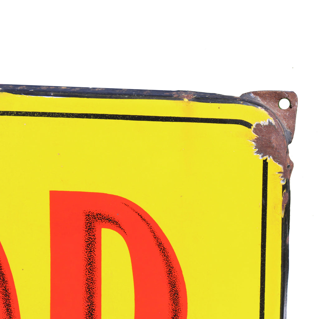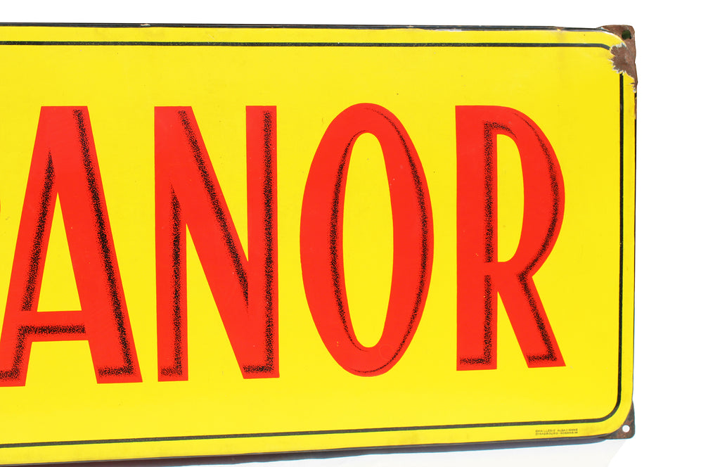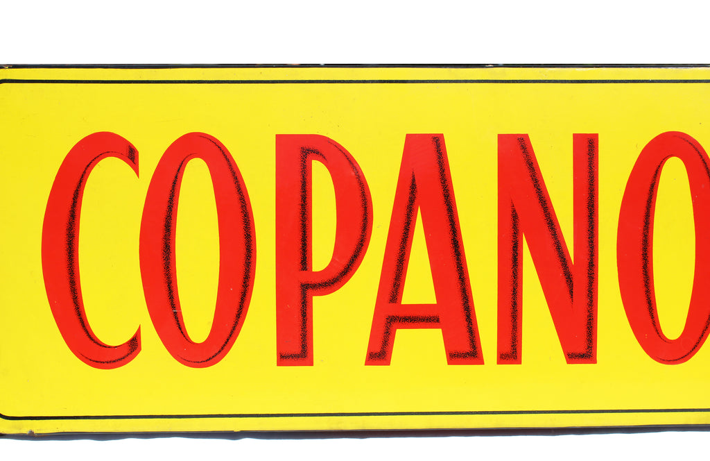 Authentique plaque émaillée COPANOR, issue de la signalétique publicitaire de l’enseigne française COPANOR (Coopérative d’Alimentation du Nord). Ce modèle rectangulaire au fond jaune et lettrage rouge est caractéristique des productions de l’après-guerre, conçu pour une visibilité maximale en façade de magasin ou en intérieur.