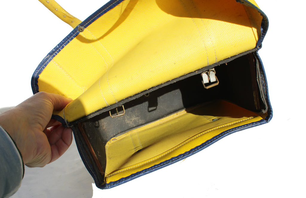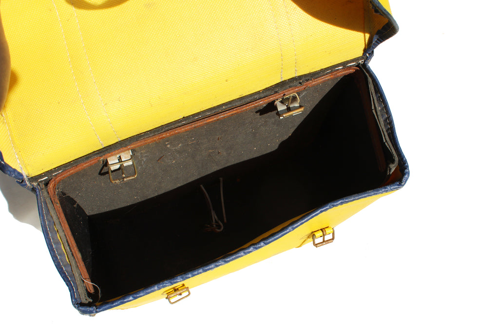 Authentique sacoche vélo de facteur La Poste, modèle ancien conçu pour la distribution du courrier. Réalisée en toile enduite / simili épaisse jaune avec finitions bleu foncé, elle est robuste, résistante et emblématique du matériel postal français.